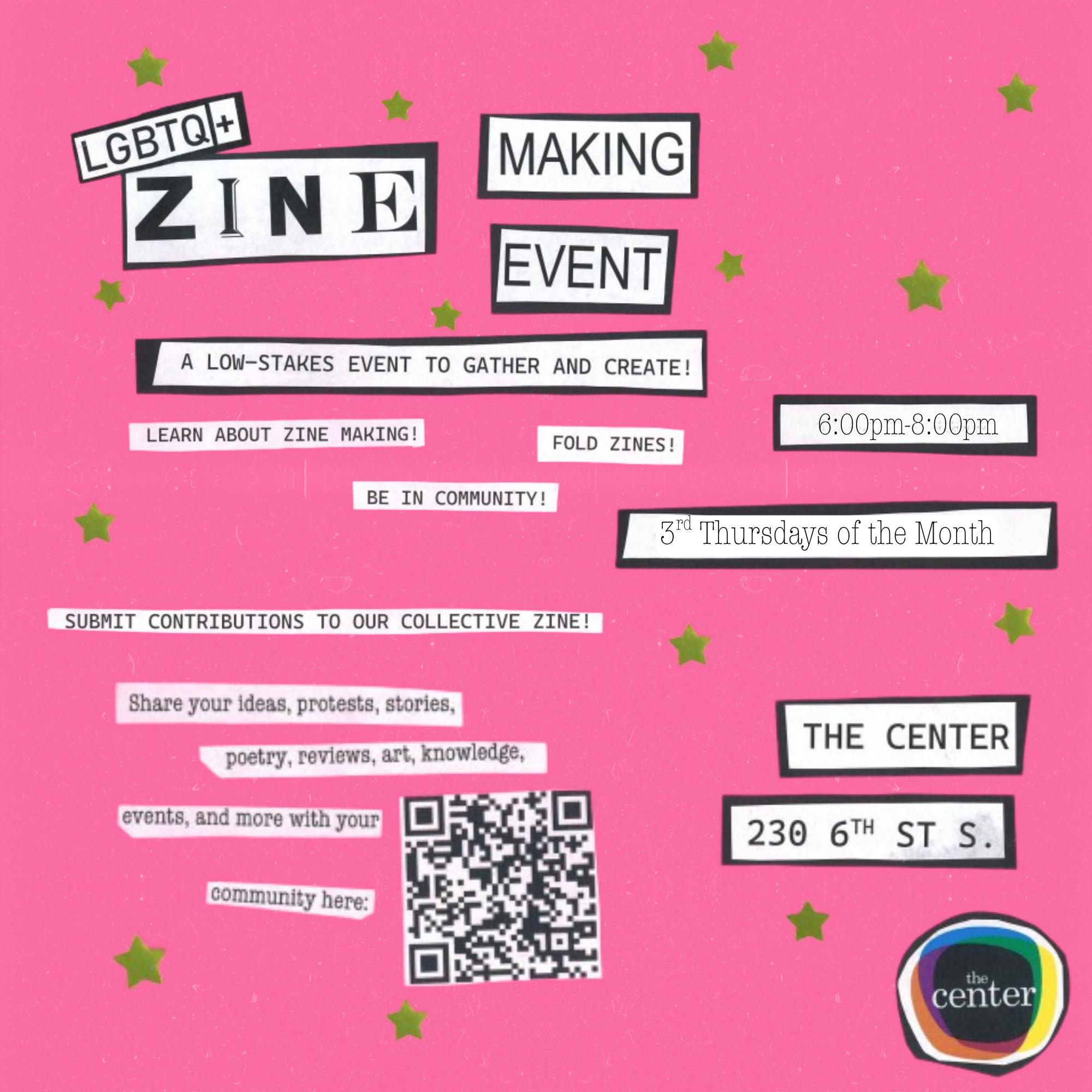 Zines have an extensive queer history due to the accessible, grassroots, and underground nature of them. The Center is supporting our local LGBTQ+ community in creating a Zine to highlight local LGBTQ+ voices, art, events and more!